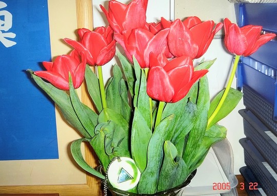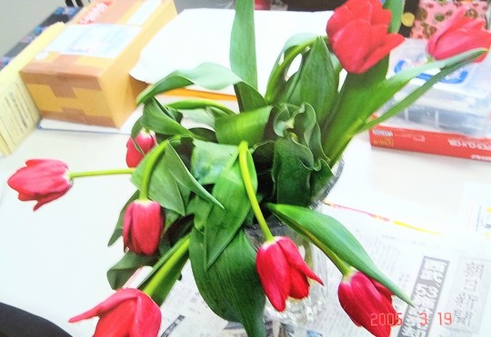 お客様が指導所にチューリップを持ってきてくださったのですが、花瓶に水を入れ飾ったのですが翌日写真のように全部しおれてしまいました。すぐにESPのねんぎょくを花瓶の口の所に置き3日後に見たら、なんと!すべてのチューリップがピンとして元気いっぱいになっていました。本当に驚きました。何でも思ったらすぐ行動です!