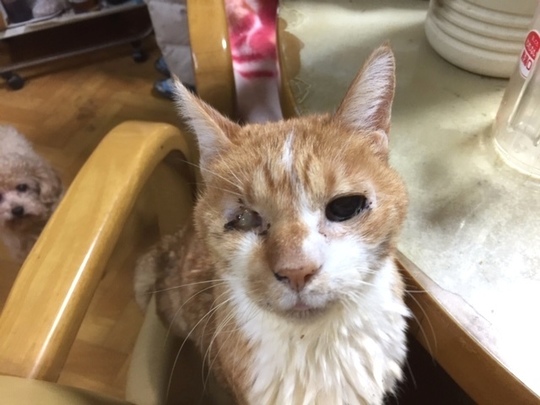右目と口の中を大けがしたトラちゃん17歳。
